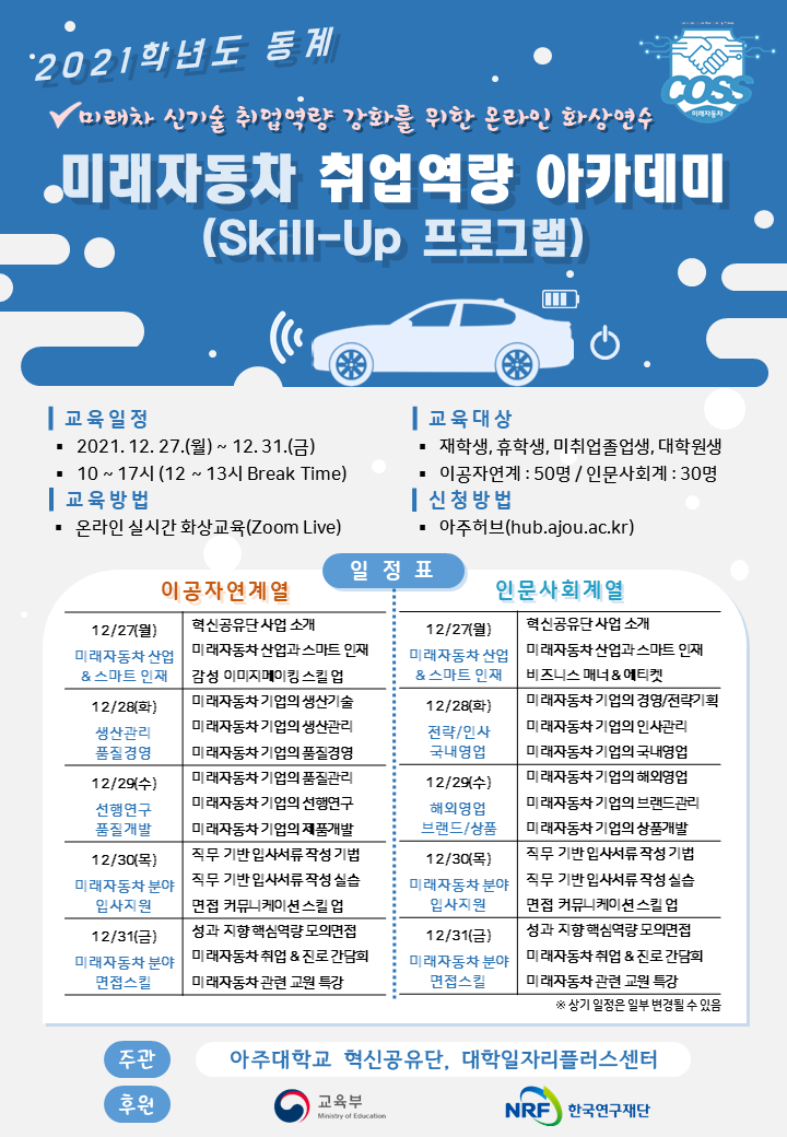 [혁신공유대학사업](재공지) 2021학년도 동계 미래자동차 분야 '인문사회계열(분반)' 취업역량 아카데미(Skill-Up 프로그램)