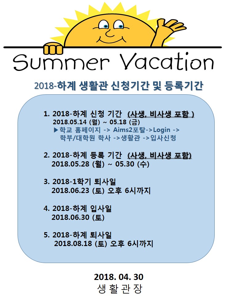 [재공지] 2018학년도 하계방학 생활관 입사 신청 안내