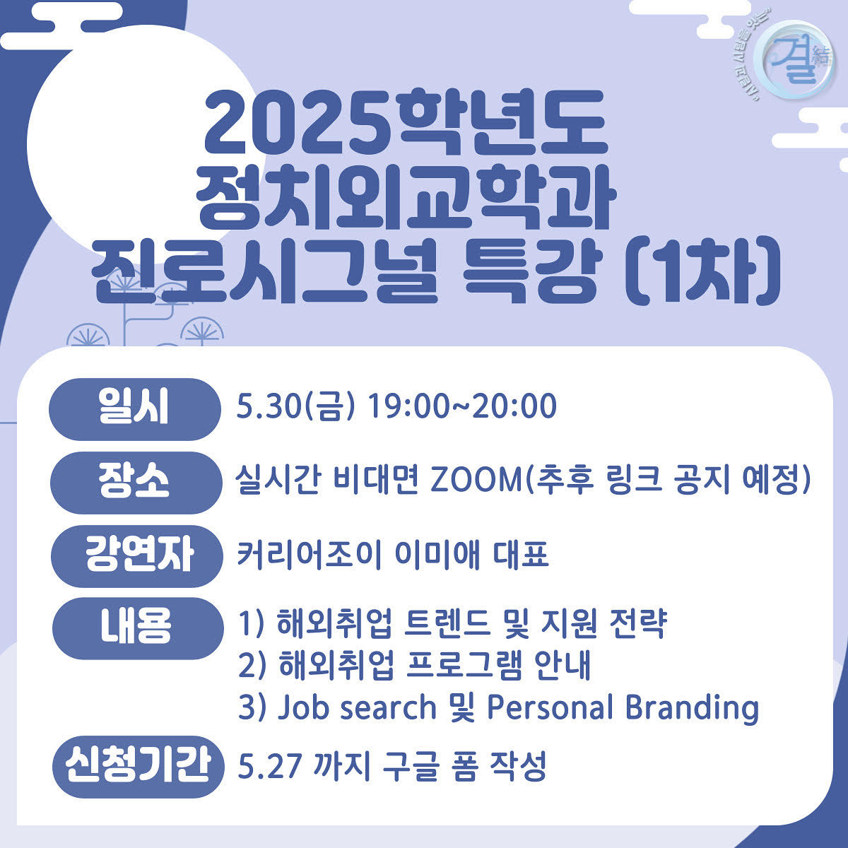 [’결(結)‘: 사람과 사람을 잇는 열두 번째 맺음 - 2025학년도 정치외교학과 진로시그널 특강 신청]